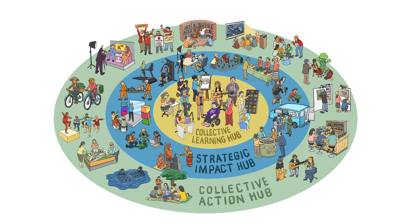 Kolaboraya menghubungkan penggerak perubahan di level tapak, organisasi, dan individu dalam satu ekosistem yang vibrant, berdampak, dan saling mendukung.